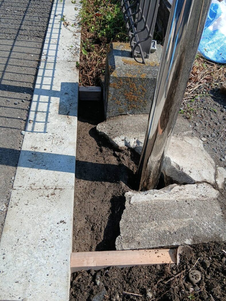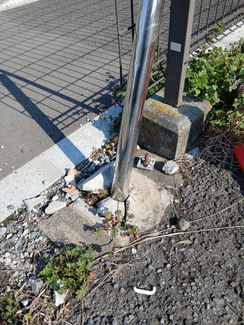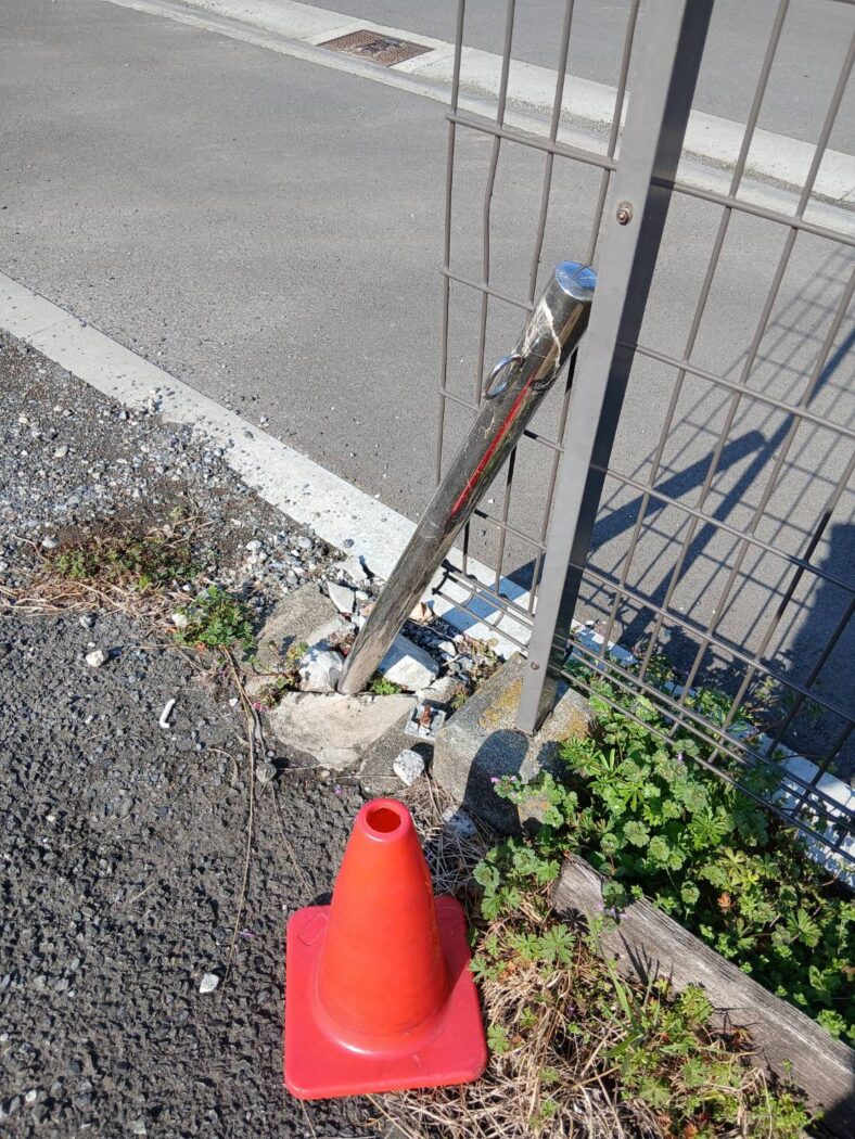 当てるのはほんの一瞬、「あ、やってしまった」という一時の出来事ですが、その結果、根元のコンクリートまでバキバキに砕けてしまいました。
