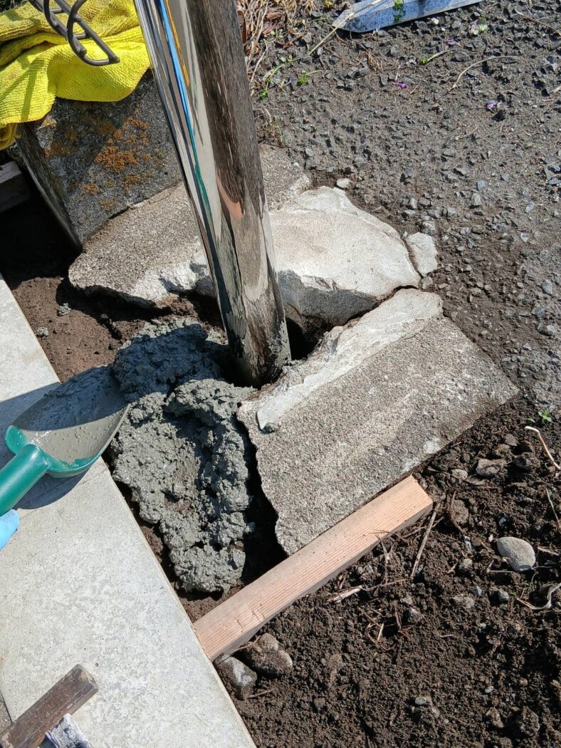 今回新しく設置したのは、信頼のブランド「サンバリカー」。 ただ差し込めばいいというわけではなく、強度が保てるよう深く差し込み、水平器を使い垂直に保ち、根元を新しいモルタルで固めていきます。