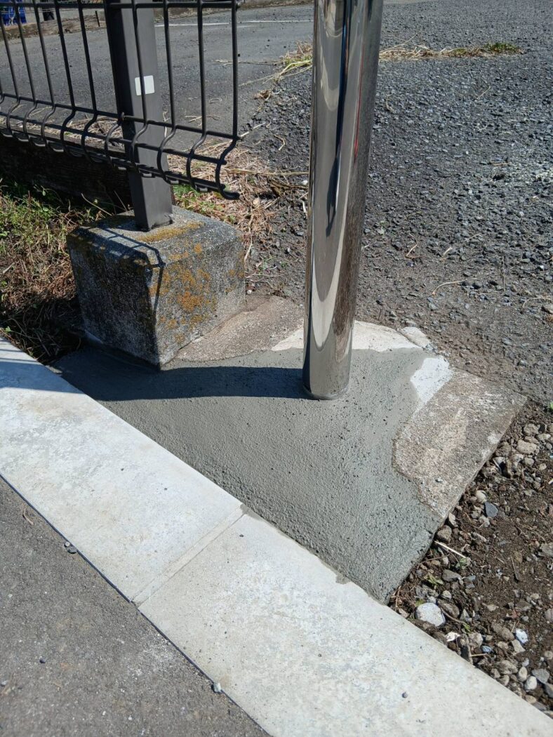 古いポールを撤去し、砕けたコンクリートを丁寧に取り除いてから、新しいポールを据え付けていきます。 (今回、金額を抑える為、はつり工事はせず生きているコンクリートは残しての施工です。)