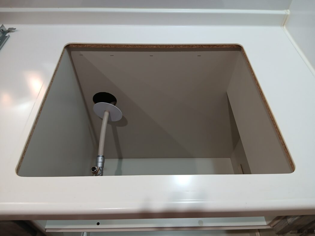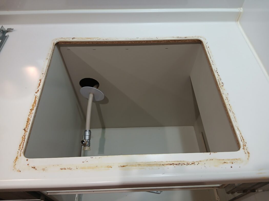 コンロが外れたらキッチン枠の汚れをキレイにして新しいコンロを置きます